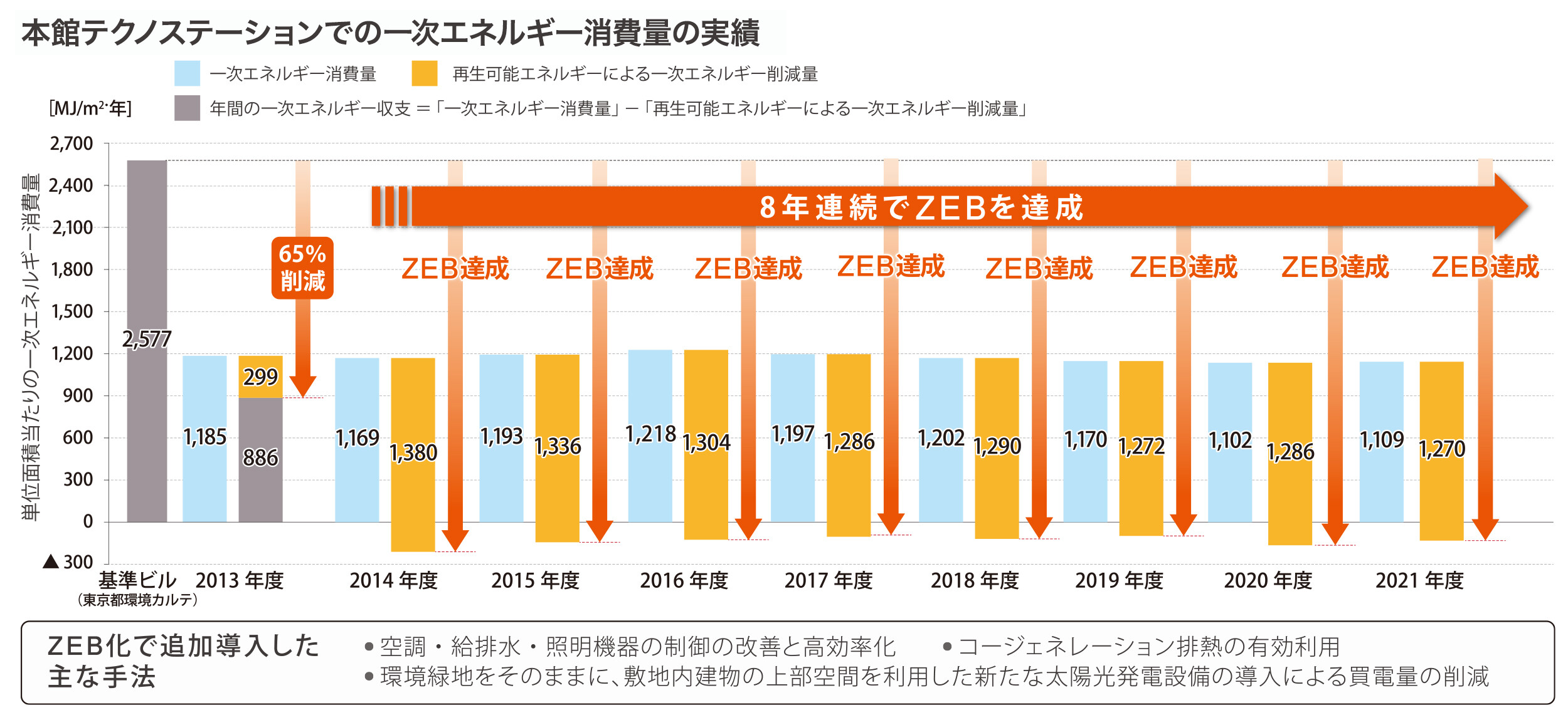 日本初!本格的なエネルギー収支ゼロを達成。2014年度の達成後、継続してソースZEB(敷地内で収支ゼロ)を達成中です。