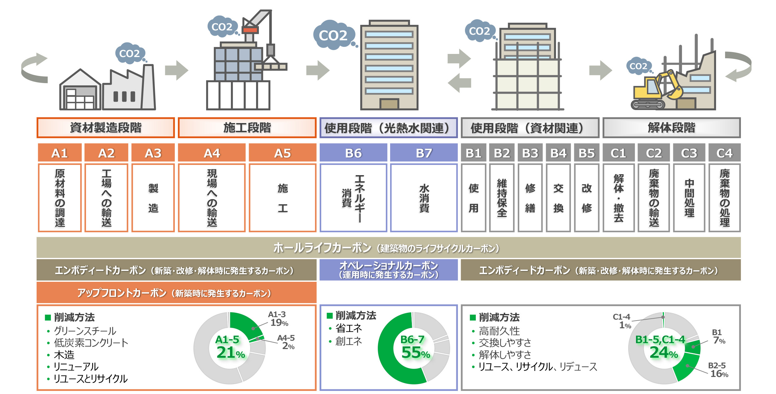 大林組はZEBの建築だけでなく、資材調達から解体までの建物のライフサイクル全体で、二酸化炭素(CO2)排出量ゼロ(正味)を目指す取り組みを行っています。