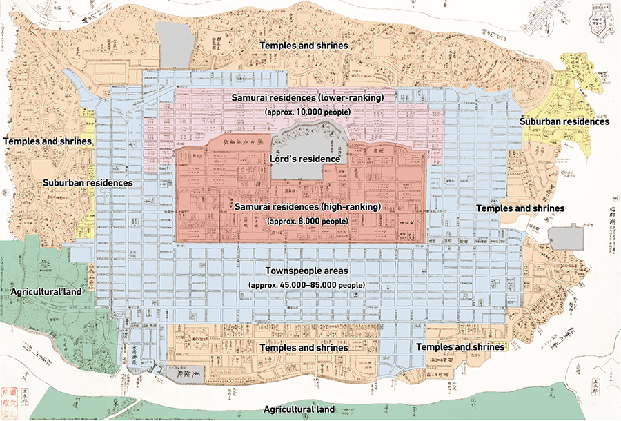 At first glance, one will notice that the entire town center was clearly divided by function, including samurai residences, townspeople areas, temples and shrines, and agricultural land on the outskirts, with the imperial palace where the castle lord resided at its heart.