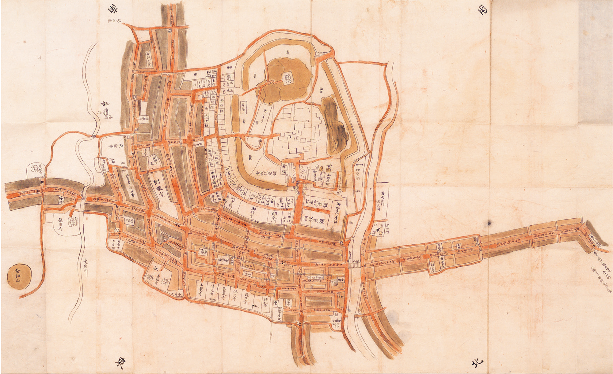 This suggests that Norinaga had meticulously planned the width of streets, districts, and the population, and he even accurately determined the sizes of samurai residences and ordinary houses at the time in order to plan the residential plots with precision. This map can thus be said to be an accurate representation of Norinaga's town plan.