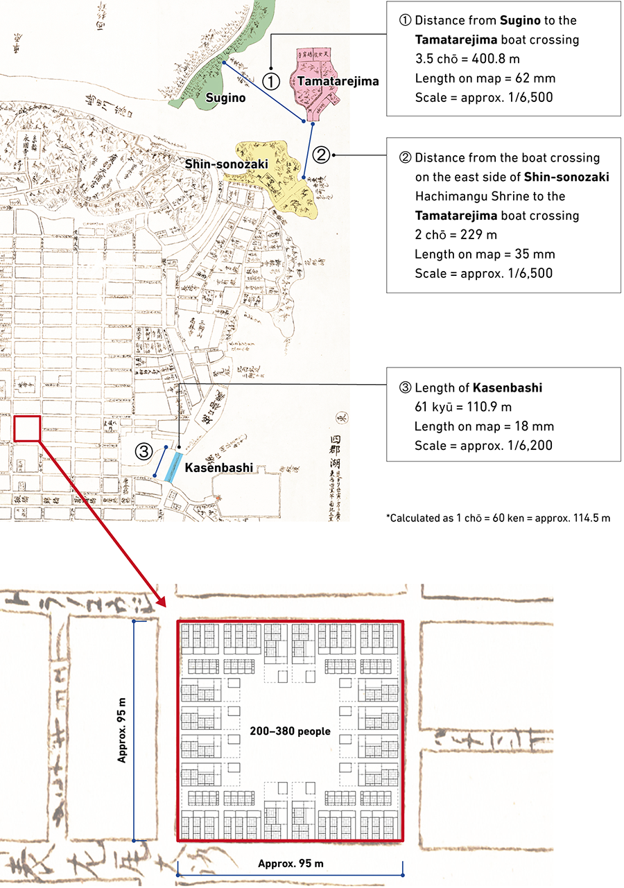 In the process of estimating the population, the project team placed town houses and samurai residences of standard sizes built during that period in each district according to the scale and found that most of these buildings fit perfectly within the plots.