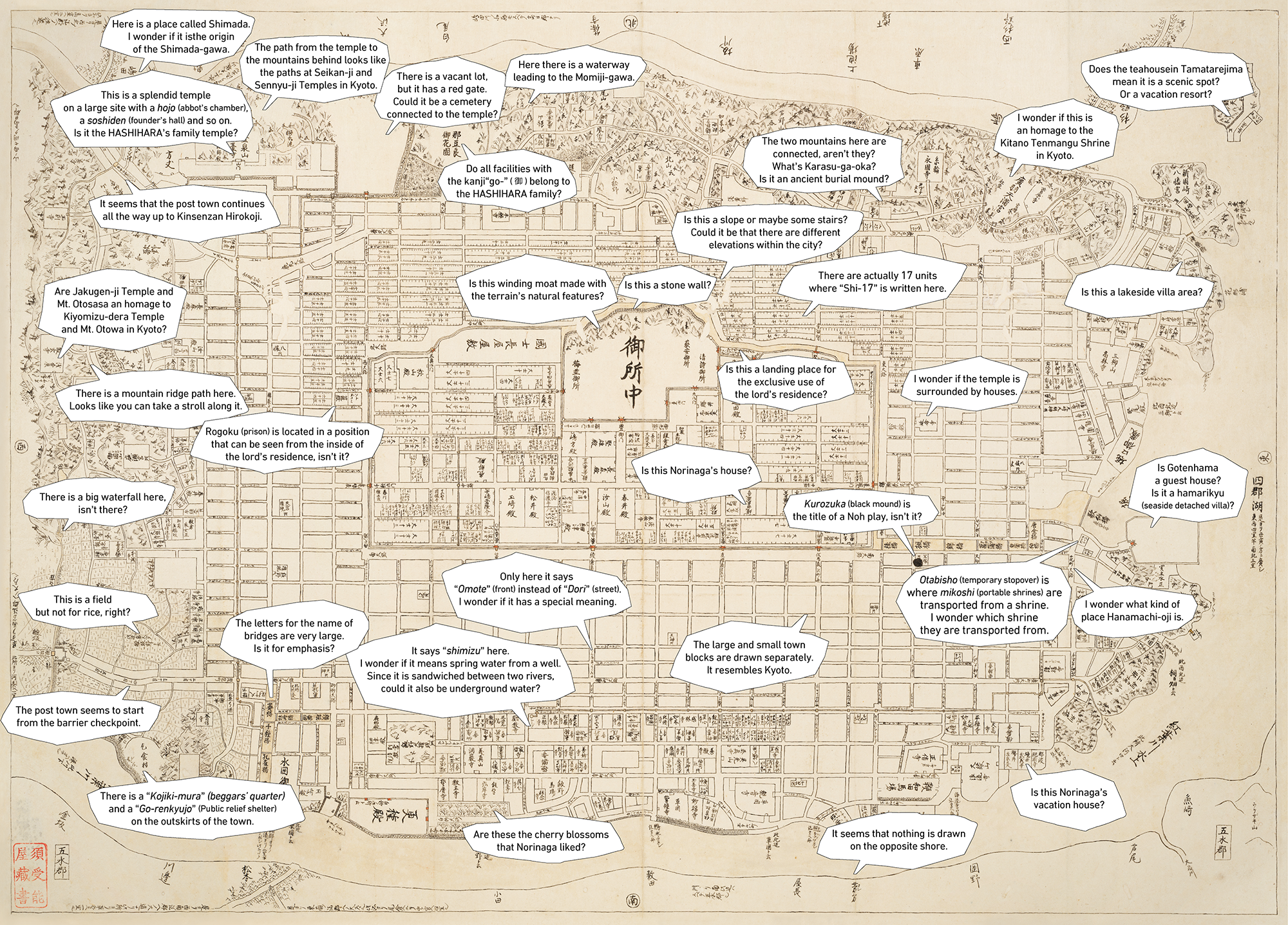 OGUNI: I believe Norinaga drew this map as a setting for expressing his own worldview. This is not simply a map of a town, but since it also assumes the presence of people, I think he wanted to express his ideal worldview, including the activities and stories the town gave rise to.