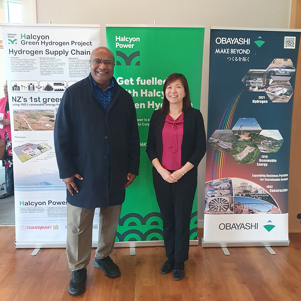 大林組がニュージーランドとフィジー共和国(以下、フィジー)で実施するグリーン水素の製造・輸送・利活用に関する実証事業(※1)は、大林組とTuaropaki Trust(以下、トゥアロパキ・トラスト)(※2)が共同で設立した事業会社Halcyon Power Limited(以下、ハルシオンパワー)(※3)がニュージーランドのタウポで製造した地熱由来のグリーン水素をフィジーに運び、現地パートナーであるフィジーガスの敷地に据え付けられた水素とディーゼルの混焼発電機で発電し、電力として利活用するものです。大林組は、実証事業の代表事業者としてプロジェクト全体の統括やフィジーでの現地調査、グリーン水素の海上輸送、フィジーガスの水素混焼発電機導入のサポートなどを行っています。