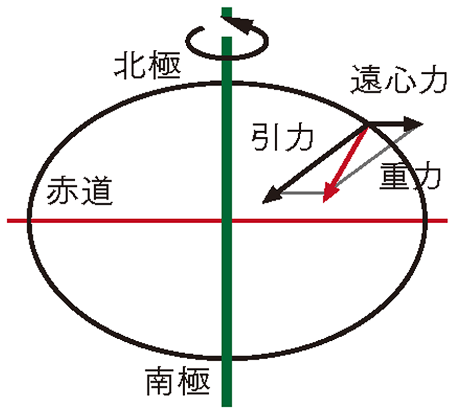 また、地球では、引力のほかに自転による遠心力が働いている。引力と遠心力を合わせた力が重力であり、その大きさは場所によって異なる。