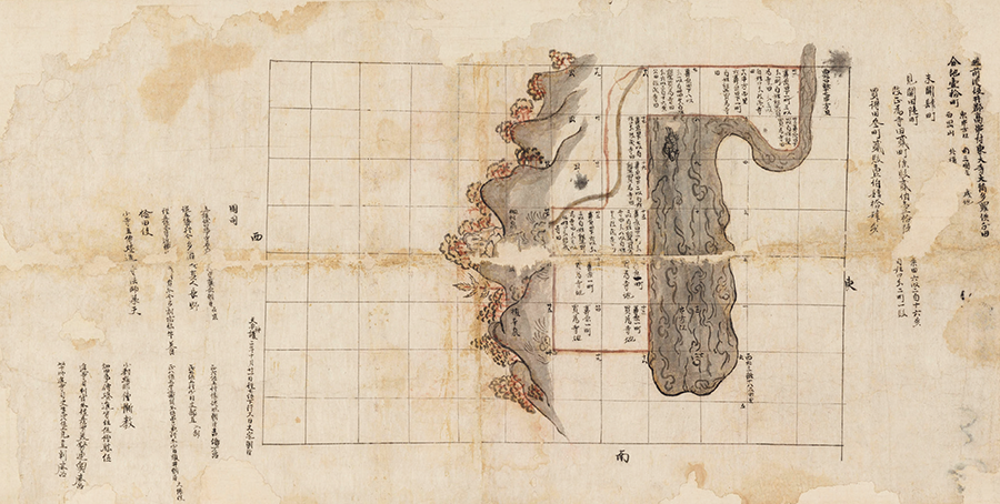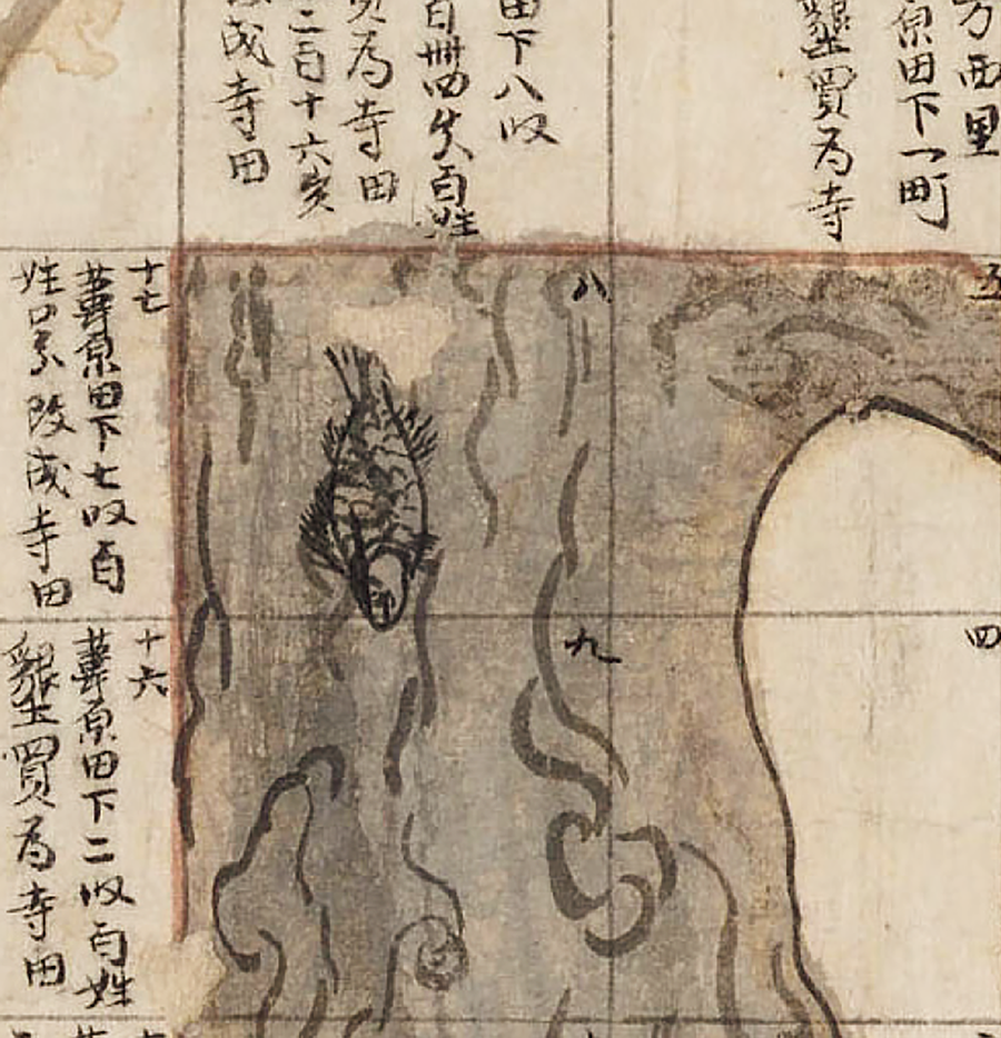現地がそれに基づいて造成されたとすると、この地図は計画図でもあり、また現地は実寸大地図のように展開している。そして、現地との照合のために山並みや樹木、池などが描き込まれているが、これも写生ではなく記号的な表現となっている。面白いのは池の中に魚らしい形が一つ描き込まれていることで、生き物は現地との照合のための目印にはならないからその意図は謎である。