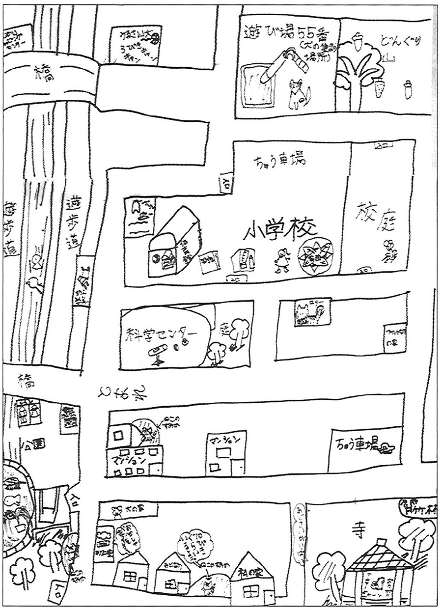 図は小学4年生(10歳)が自宅付近の様子を描いたものである。用紙を前にして、自宅が自分に最も近い手前下の中央に描かれている。そこから情景が上に向かって自分から離れるように、小学校を経てさらによく利用する遊び場までが展開している。左手に縦に川、公園、池が配置されており、右手の端は道路で終わっている。気づくのは、描写されているものは全て記号的なイメージとなっており、例えば木の形は同じであり写生的ではないということである。しかし、木であることは明快に伝わり感じも悪くない。空間配置も実距離に比例しておらず伸び縮みさせて構造を単純化させている。生活や遊びと関係が深い動植物が記号的に丹念に記入されている。