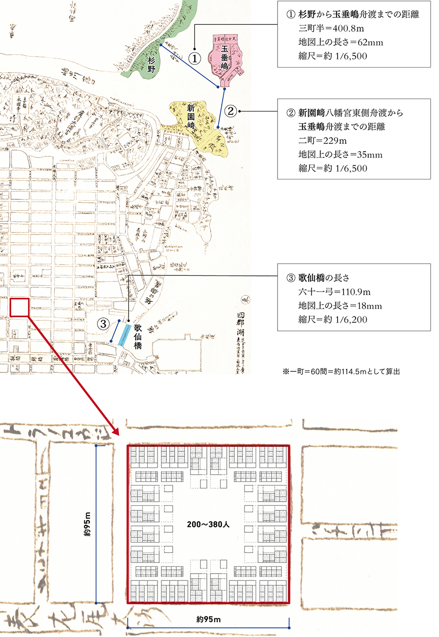 このうち①②については、当時の地図が市街地から離れた周辺部ほど、距離の表現が正確性に欠ける例が多いことから、縮尺に基づかないノンスケールだと判断した。そこで③の実測値を採用して「端原氏城下絵図」の縮尺を約6,200分の1と設定した。縮尺から算出した市街地の面積は東西に約3km、南北に約2kmの約6km2で、現在の東京都千代田区の半分程度の規模である。