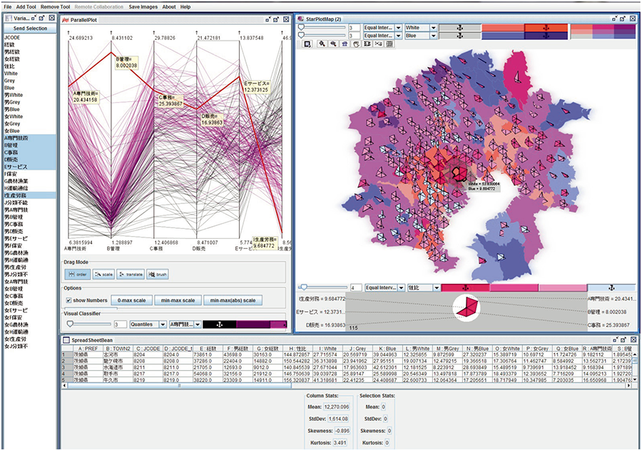 左は職業大分類から6つの職種を選んで描いた並行座標プロット、右はホワイトカラーとブルーカラーの就業者を色分けして表した地図の上に男女別職業別人口を表す星形図を配したものである。星形図は就業者の性比によって色分けして合計7変数を同時に地図化している。左右の図の対応をみるために、右図の東京都港区の値を左の図では太い赤線で示しているが、他の地域と異なる傾向を示すことから、当該地域が職業構成において特異な性格をもつことがわかる。