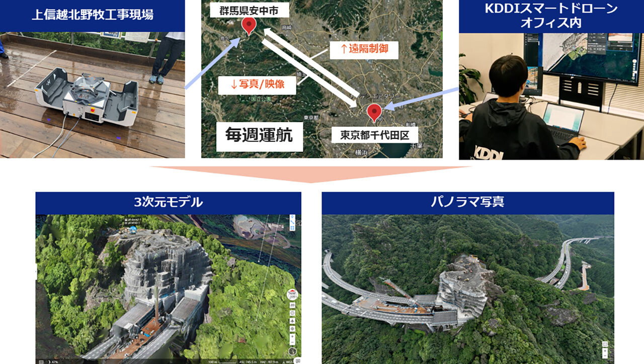 株式会社Liberaware(本社:千葉県千葉市、代表取締役:閔弘圭、以下リベラウェア)とKDDIスマートドローン株式会社(本社:東京都千代田区、代表取締役社長:博野雅文、以下KDDIスマートドローン)と株式会社大林組(本社:東京都港区、代表取締役社長:佐藤俊美、以下、大林組)の3社は、大林組が施工する上信越自動車道(落石対策)北野牧工事(以下「本工事」)において、国内で初めて(※1)建設現場に自動充電ポート付きドローンを1年間常設し、現場補助者なしの目視外飛行(レベル3)(※2)による週次の遠隔自動測量を継続運用しました。この取り組みにより、掘削量(体積)や現場の地形など進捗状況を高精度に可視化することを実現しました。