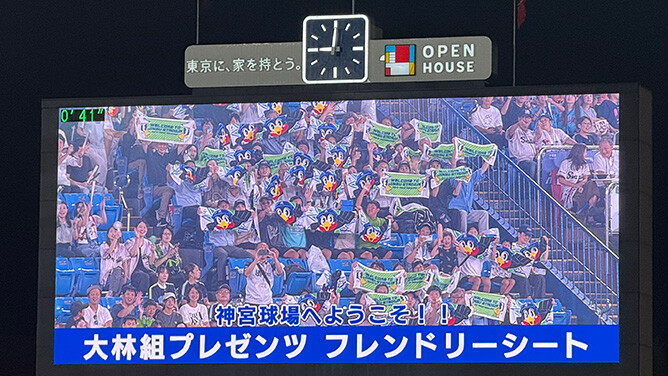 大林組は社会貢献基本方針のもと、地域のコミュニティの一員として、次世代を担う子どもたちの夢や未来をサポートするさまざまな取り組みを行っています。その一環として、神宮球場(東京都新宿区)で行われる東京ヤクルトスワローズの公式戦に子どもたちを招待するフレンドリーシートに、2008年から協賛しています。