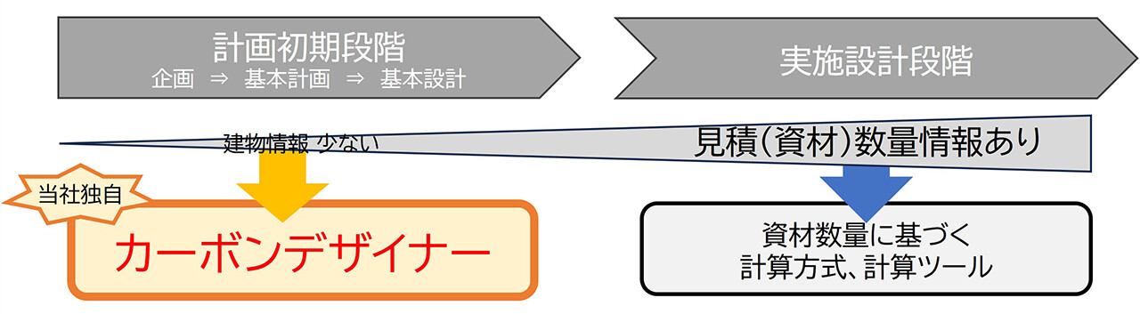 ホールライフカーボン削減の取り組みを具体化するためには、ホールライフカーボンを計画初期段階で把握することが重要です。一方、既存のホールライフカーボン算定ツールは資材の数量情報の入力が必要であり、建物の仕様が未確定な計画初期段階では活用が困難という課題があります。