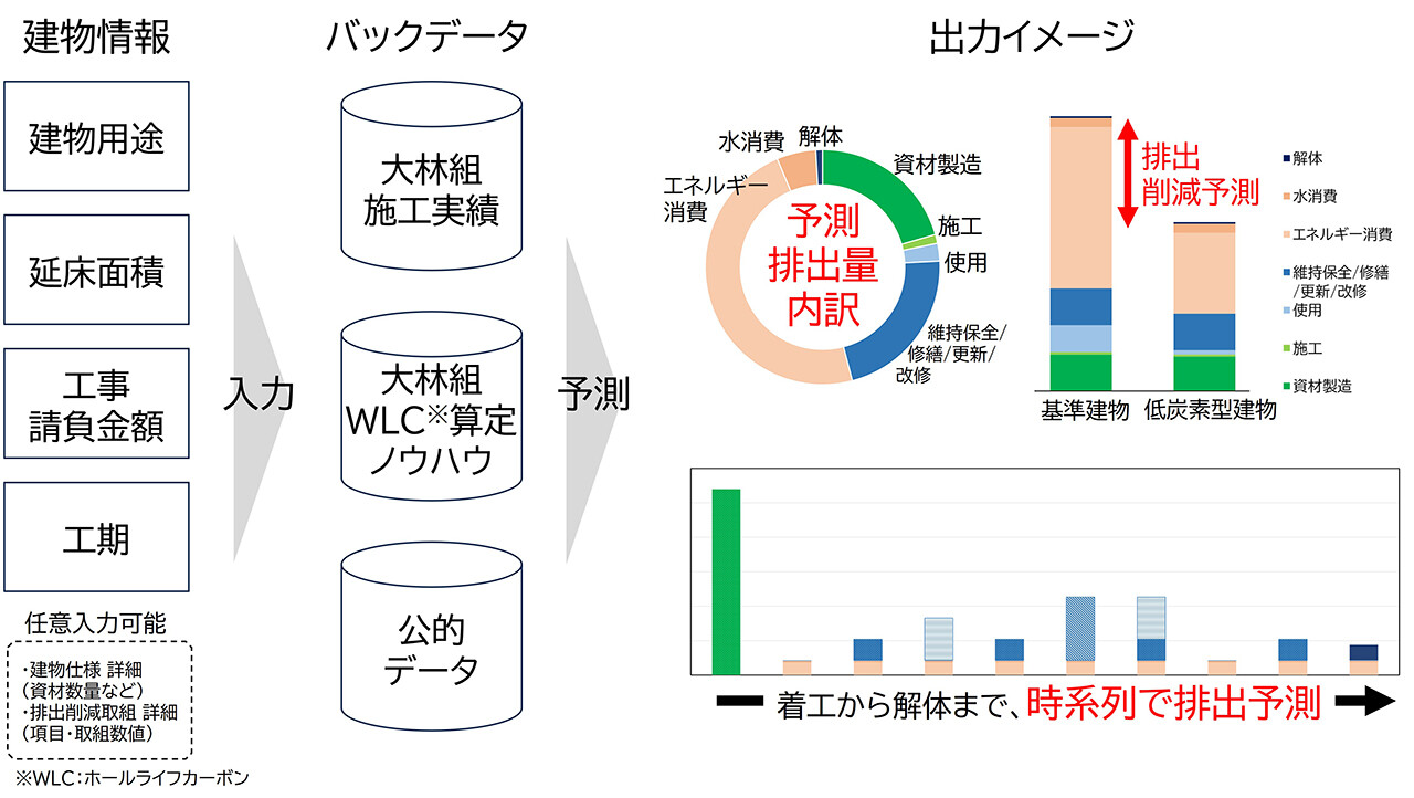 「建物用途」「延床面積」「工事請負金額」「工期」の4項目の情報を入力すると、大林組の施工実績や算定ノウハウおよび公的データによりホールライフカーボンの即時予測が可能です。また、着工から解体までの時系列で排出予測も可能です。加えて、必須4項目以外の詳細情報の追加入力にも対応しており、検討の進捗に応じて予測精度を高めることができます。
