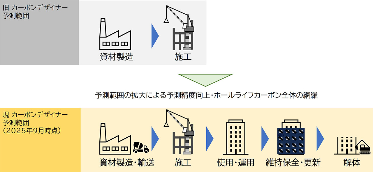 資材製造~施工段階のCO2排出量予測方法の見直しおよび項目拡充により、その予測精度向上を図りました。また、予測範囲を解体段階まで拡大させ、ホールライフカーボン全体を網羅しました。
