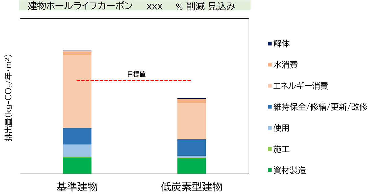 建築物の資材製造から解体・廃棄に至るまでのライフサイクル全体で排出されるCO2などの温室効果ガスの量 - ※3 予測結果は設定された計算条件に基づく概算値であり、保証値ではありません
