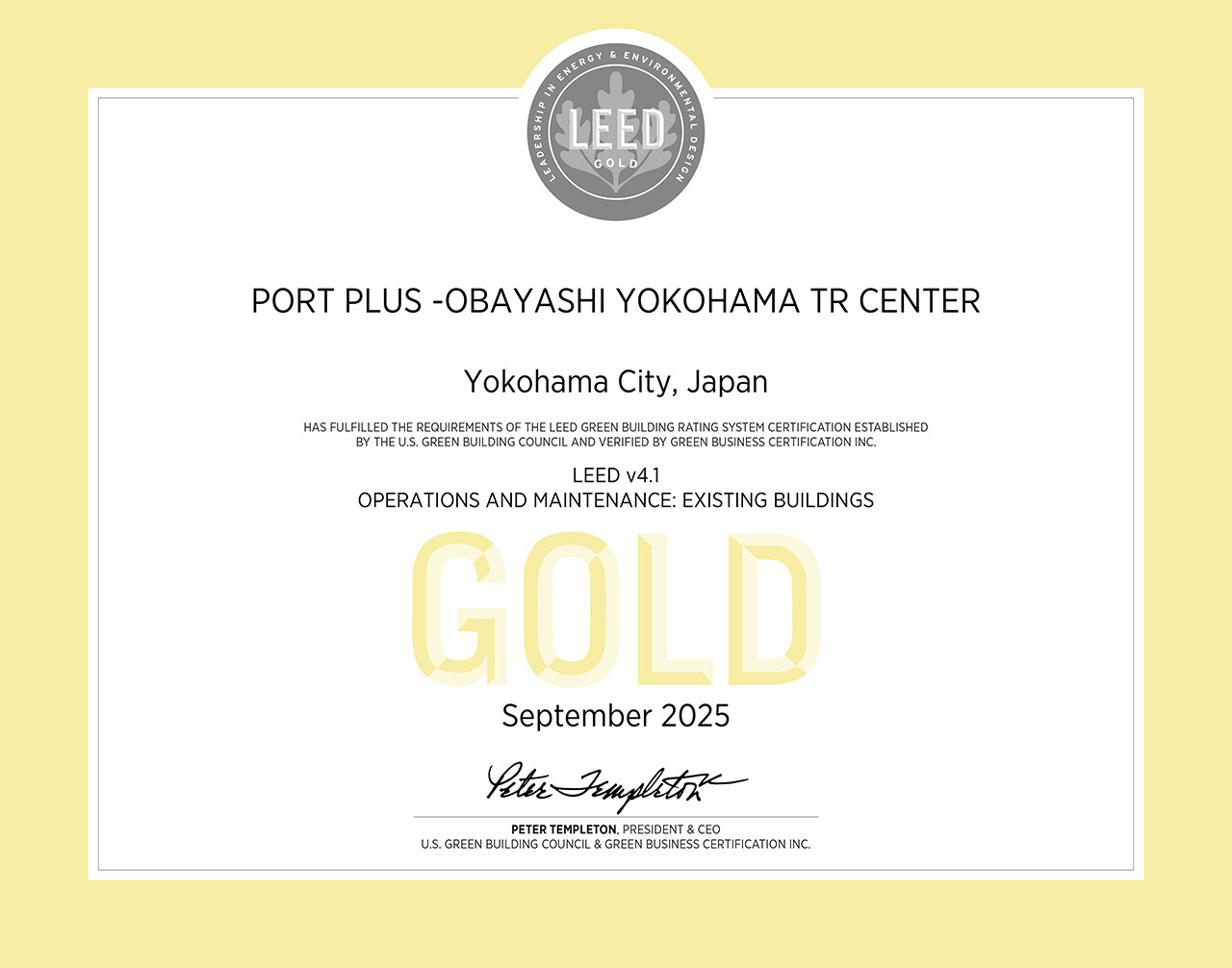 自社研修施設「Port Plus®」が、既存建物の運用・保守を評価する「LEED O+M」のゴールド認証を取得