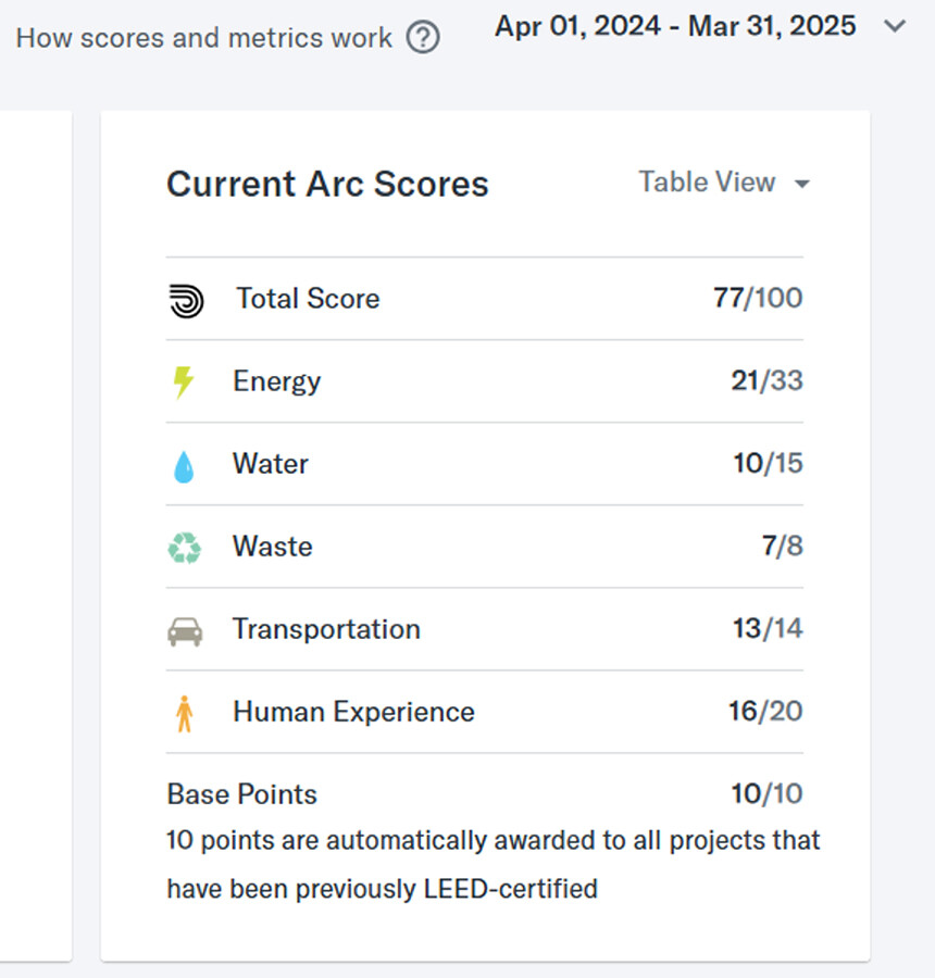 Arcによりエネルギー消費量、水使用量、廃棄物量、交通利用による温暖化ガス排出、滞在時の快適性などがタイムリーに数値化される。これら数値をモニタリングし、改善点を探ることが可能となる