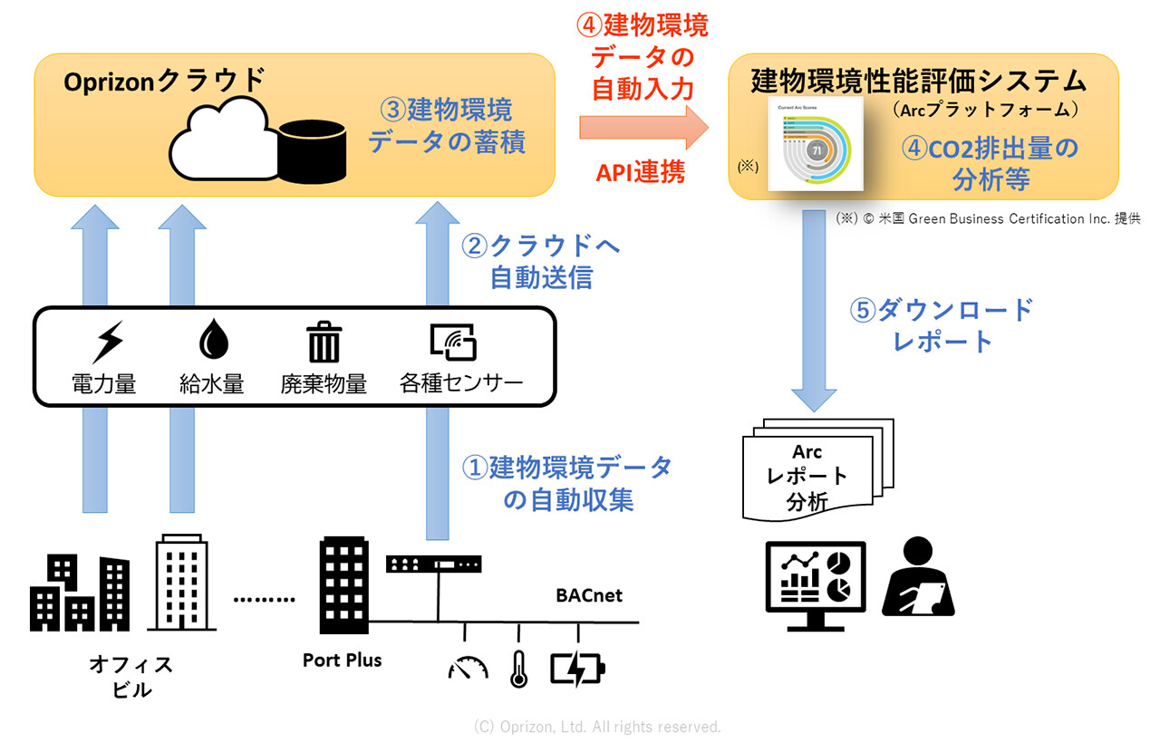 建物環境データの取得・可視化・分析を行う際には、各設備機器のデータを中央監視システムなどから抽出して、別システムに再入力する方法が一般的だが、オプライゾンは、これら一連の作業をAPI連携により自動で行うことを目指し、Arcの「建物環境性能評価レポート」の自動作成に日本で初めて成功した