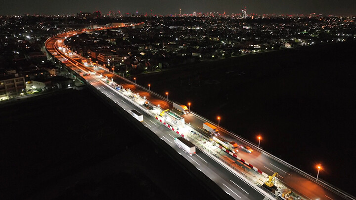 首都圏6車線では日本初となる床版取り替え工事の取り組みを紹介します。1日当たり10万台の車両が往来する重交通区間において、幅員方向多分割施工をはじめとするさまざまな工夫により、通行止めを行わず6車線を確保しながら床版取り替えを実現しました。