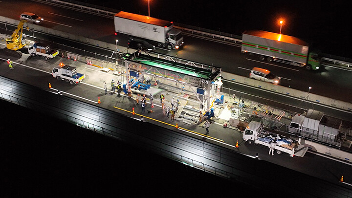 「DAYFREE(デイフリー)」は、高速リニューアル工事における橋梁床版取り替え工事を夜間の1車線規制のみで完了する新しい工法です。夜間の限られた時間内で既設床版撤去から新たな床版の架設が可能となるため、日中の交通規制が不要となり、渋滞の発生を緩和します。