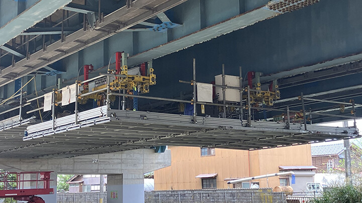 「ムーバルデッキ」を、常に吊り足場先端にラップさせることで、足場設置・解体時の危険な開口部を解消でき、安全性が向上します。作業箇所が点在する橋梁点検・補修工事などに用いることで、橋梁点検車などでの施工に比べ、コスト削減、社会的影響の低減が可能です。