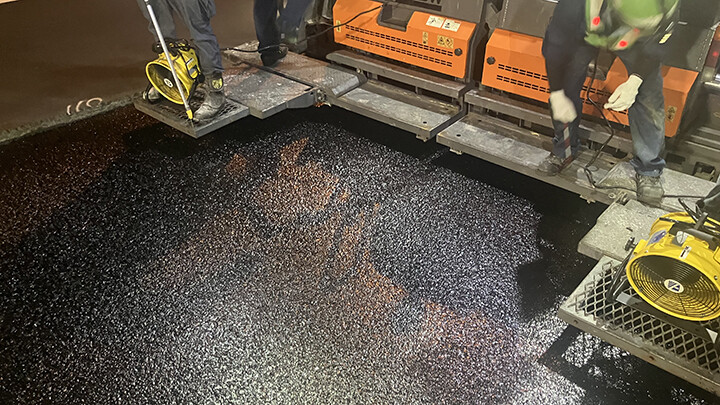 「eグース・スーパー」は、水密性が高く耐久性に優れたコンクリート床版にも適用可能なグースアスファルト混合物です。鋼床版用のeグースをコンクリート床版に適用するため、一般的には相反する製造温度低減と施工性改善の双方に取り組み、開発したものです。