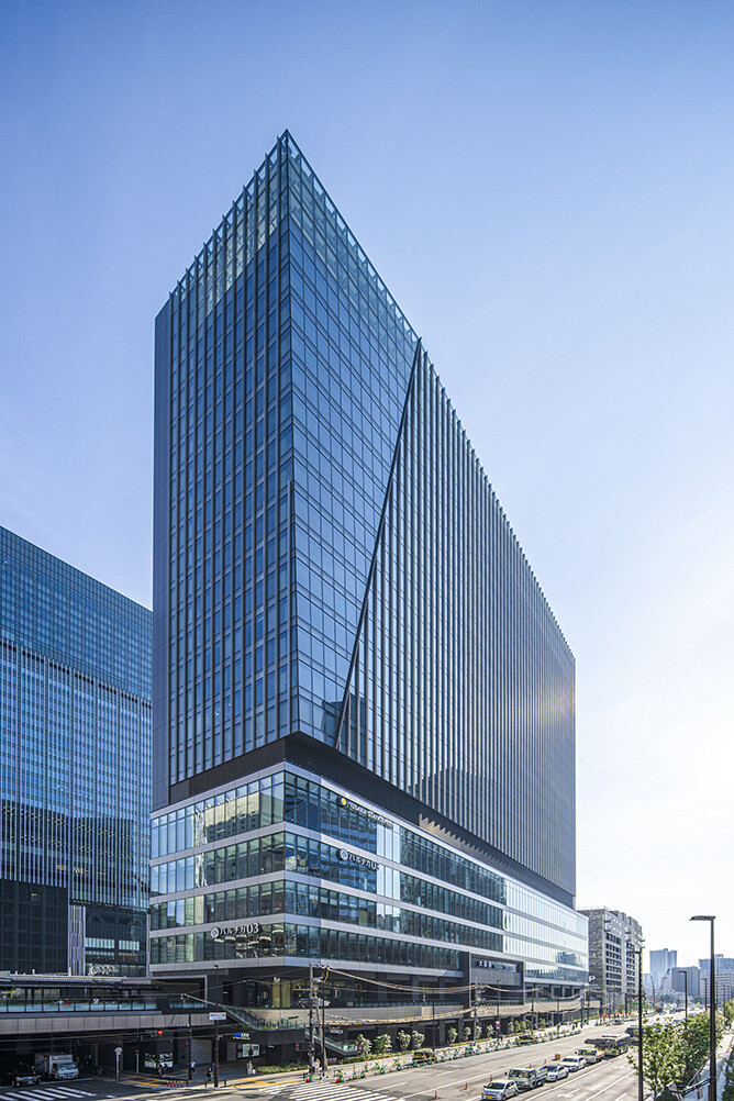 緑豊かなグラングリーン大阪を望む敷地北側は、テナントスペースと眺望を最大化するためガラスファサードを配し、南向きの線路側は日射負荷、騒音対策のためガラスシャフトのコアを集約しました。