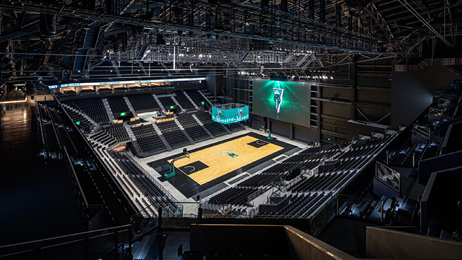 南北に細長く、海に囲まれた突堤という特殊な敷地に位置する本アリーナは、馬蹄(ばてい)型のスタンド形状にすることで、約1万人の座席を確保するとともに、客席全体がコートやステージに近く、他にない熱狂と臨場感あふれる環境を実現しました。