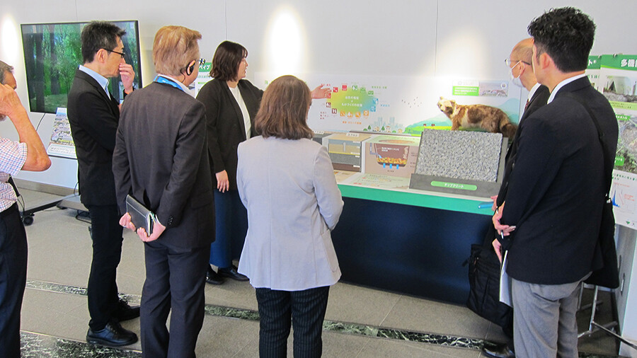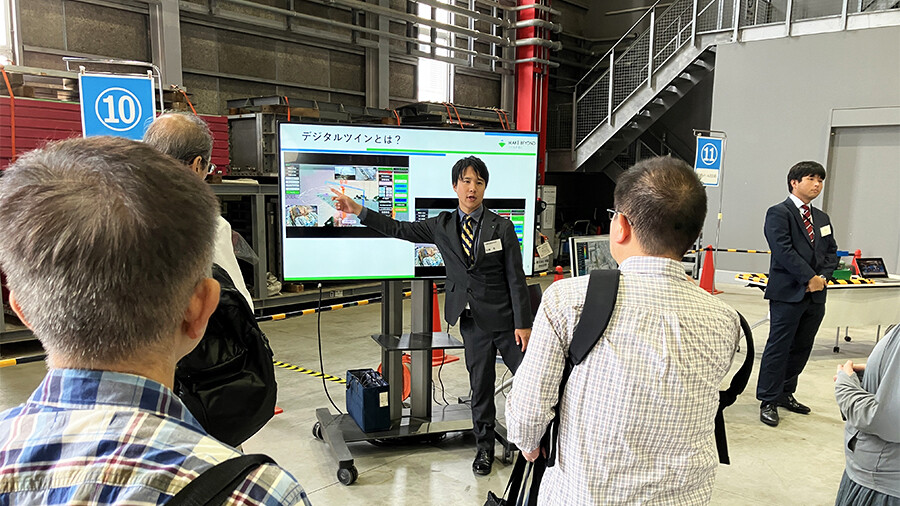 大林組技術研究所(東京都清瀬市)は、1965年の開設以来、技術開発の中核組織として独自性豊かな技術を創出し、実証実験によって確かなものを社会やお客様に提供する役割を担ってまいりました。今年の12月で開設から60年を迎えることを記念して、10月17日、18日に清瀬市民、大林グループの従業員とその家族を対象とした見学会を開催しました。見学会には子どもから大人まで、2日間で計757人が参加しました。 当日は、今年開催された大阪・関西万博の大屋根リングやおさかな牧場、宇宙エレベーターなどの脱炭素社会実現に向けた取り組みや、未来への構想をパネルや模型で紹介しました。また、大林組が開発したさまざまな建設技術について、技術研究所内の各実験施設で担当研究員が説明を行いました。 建材や設備機器をリユースして建設が進む実験棟「オープンラボ3」の紹介パネルを興味深そうに見る参加者 さまざまなシミュレーション技術を用いて技術研究所を一つの「まち」として再現するデジタルツイン(※1)を紹介