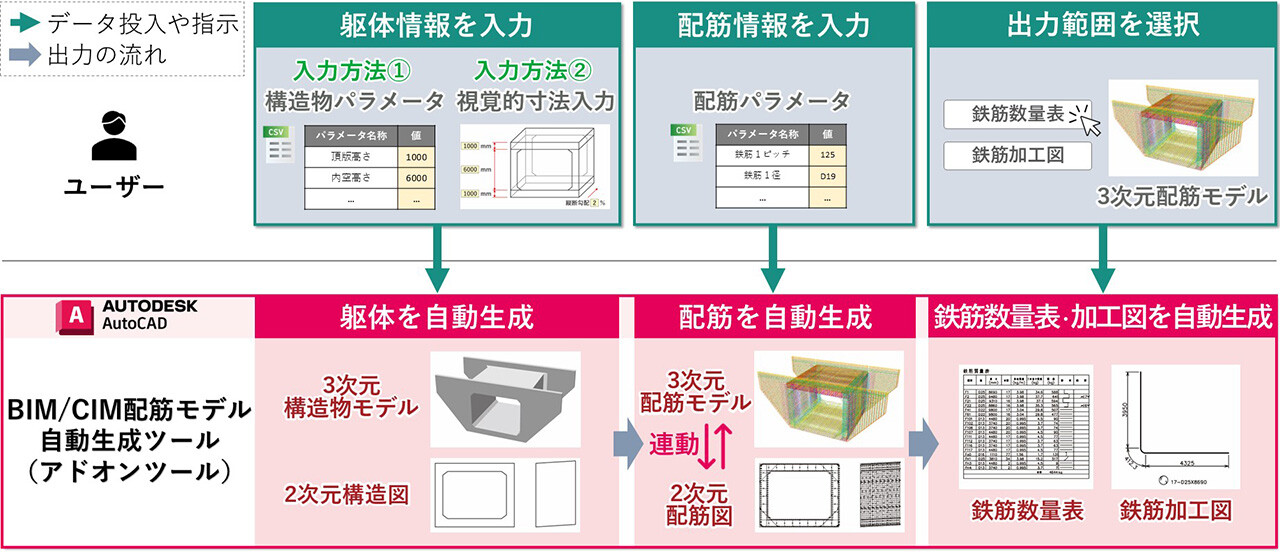 土木事業では、3次元のBIM/CIMモデルの活用が進んでいますが、現状では発注者へ納品する2次元図面を作成した後に、BIM/CIMモデルを作成し、さらに2次元図面との整合を照査する必要があります。複雑な配筋モデルの構築には多大な時間を要することに加え、2次元図面とBIM/CIMモデル間の齟齬(そご)による手戻り作業が生じ、モデル作成作業の効率化、品質確保を困難にしている要因の一つとなっていました。