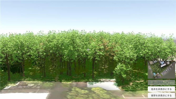 環境省の「自然共生サイト」に認定されている大林組技術研究所(東京都清瀬市)内の雑木林の管理に、デジタルツインを用いています。低木や草木類を伐採・除草したときの景観をシミュレーションできます。