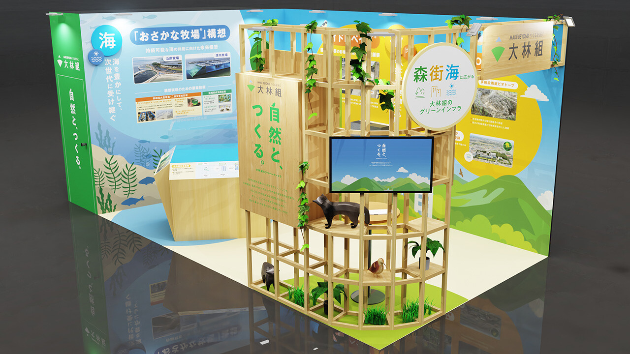 大林組は「自然と、つくる。」をテーマに掲げ、山里、都市、海辺のニーズに対応した幅広いグリーンインフラ技術を展開しています。今回の展示会では、令和7年度「気候変動アクション環境大臣表彰」大賞を受賞した多機能舗装「ハイドロペイブ®」、海を豊かにして次世代に受け継ぐ「おさかな牧場®」構想、雑木林のデジタルツイン技術などを展示します。皆様のご来場を心よりお待ちしております。