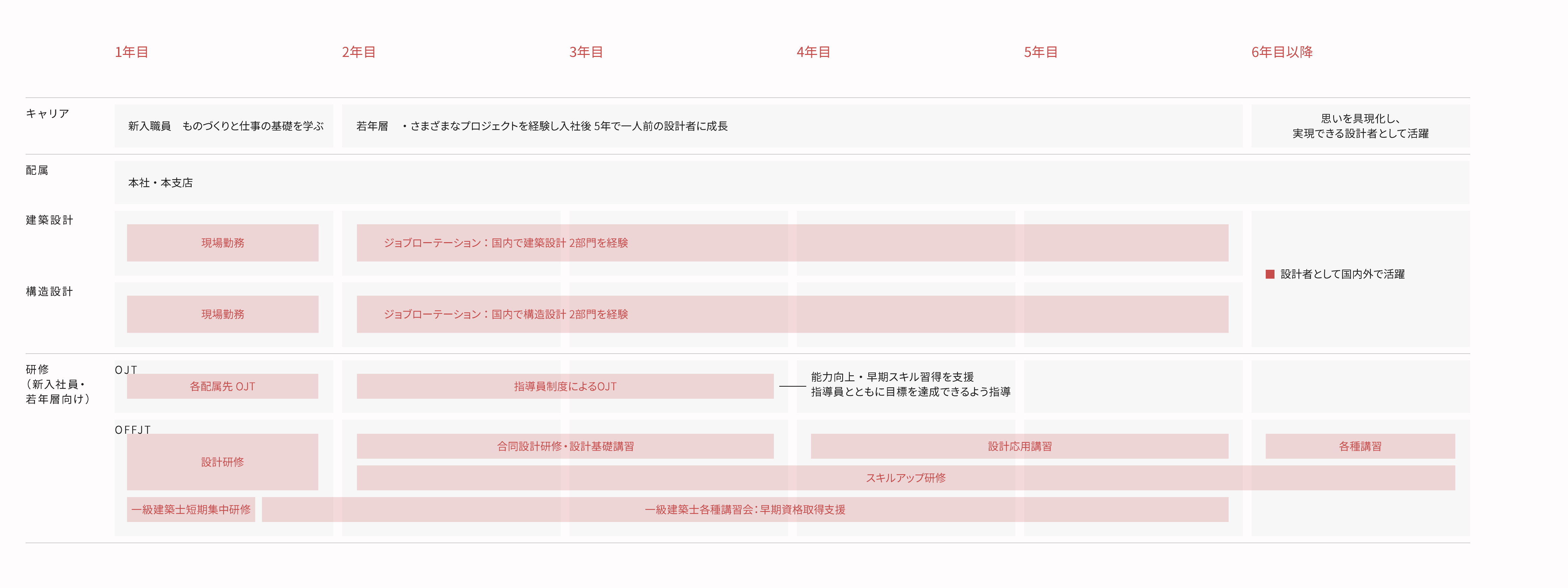 入社5年目までの若手職員には、より多く経験を積むことができるようなキャリアパスを設けています。一人前の設計者となることをめざし、まず入社後1年間は建設現場または生産設計部への配属で、実際のものづくりを経験します。その後は設計部門に配属、さまざまなプロジェクトを担当します。