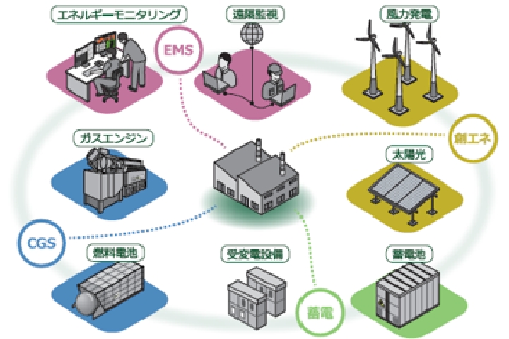 「再生可能エネルギー発電、創エネ、蓄電等の設備」と「エネルギーマネジメントシステム」を組み合わせ、最適なエネルギー利活用システムの計画・設計・調達・施工・試運転を一気通貫で取り組んでいます。
