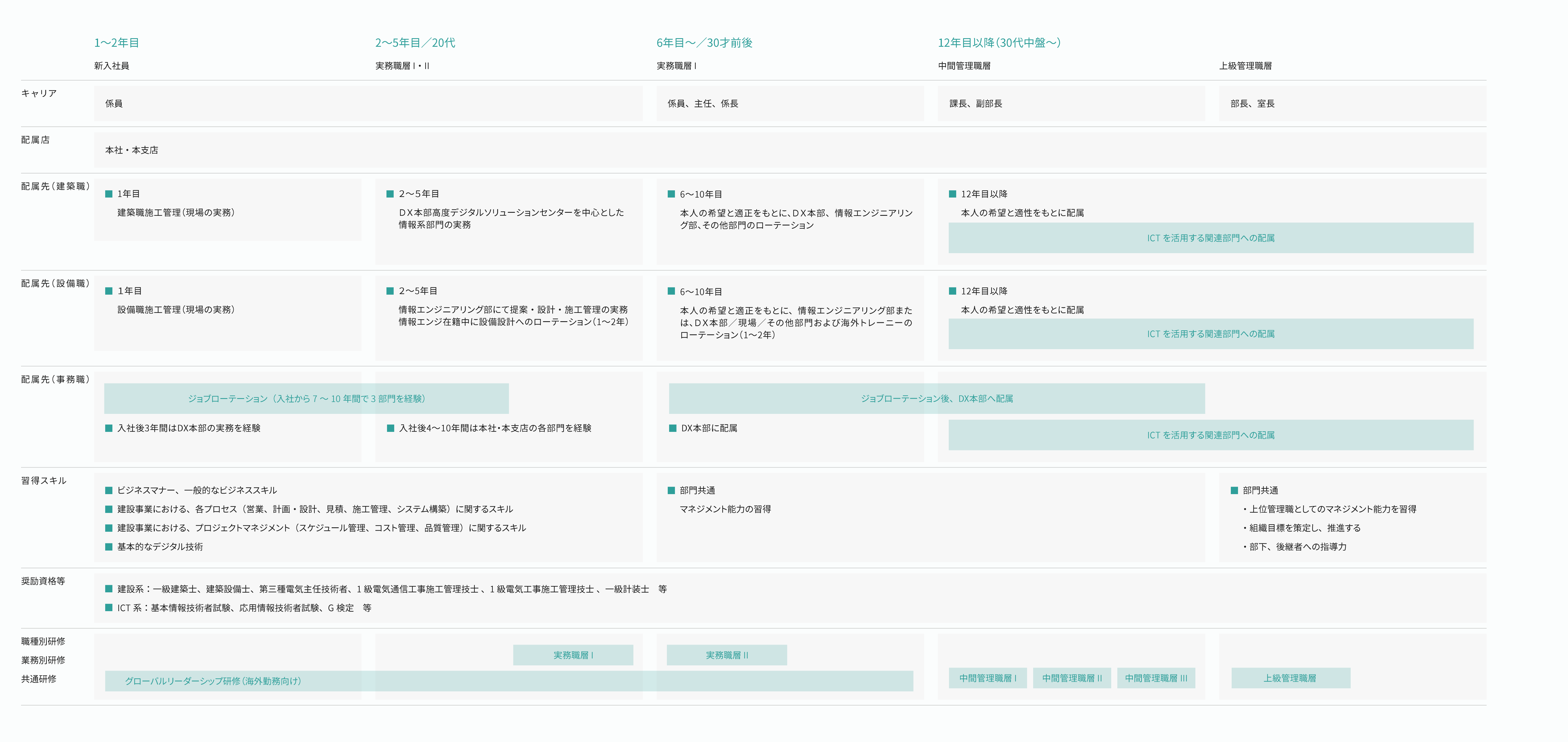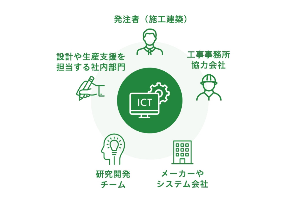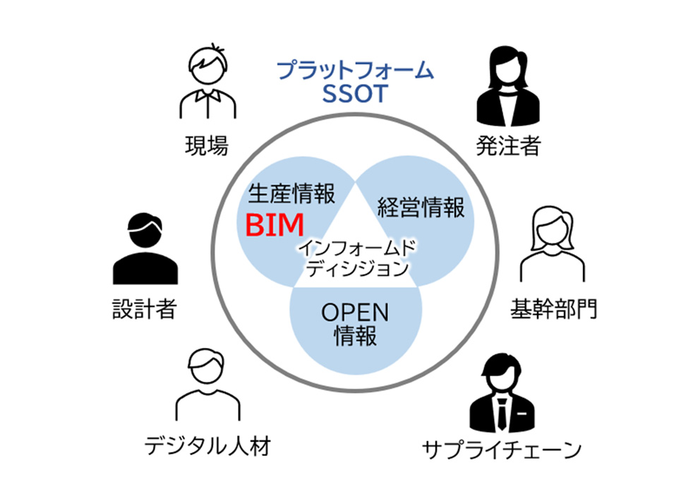 近年では、BIM情報を建設事業の基盤とし、ドローンや点群処理技術による現場作業の生産性と品質の向上、AIを活用した全社的な課題解決、社内デジタル基盤の整備、社外顧客向けには、オフィスビル、工場、スポーツ施設、ホテル、学校、病院等の建物のデジタル化による付加価値工場など、活躍の場は社内外に広がっています。