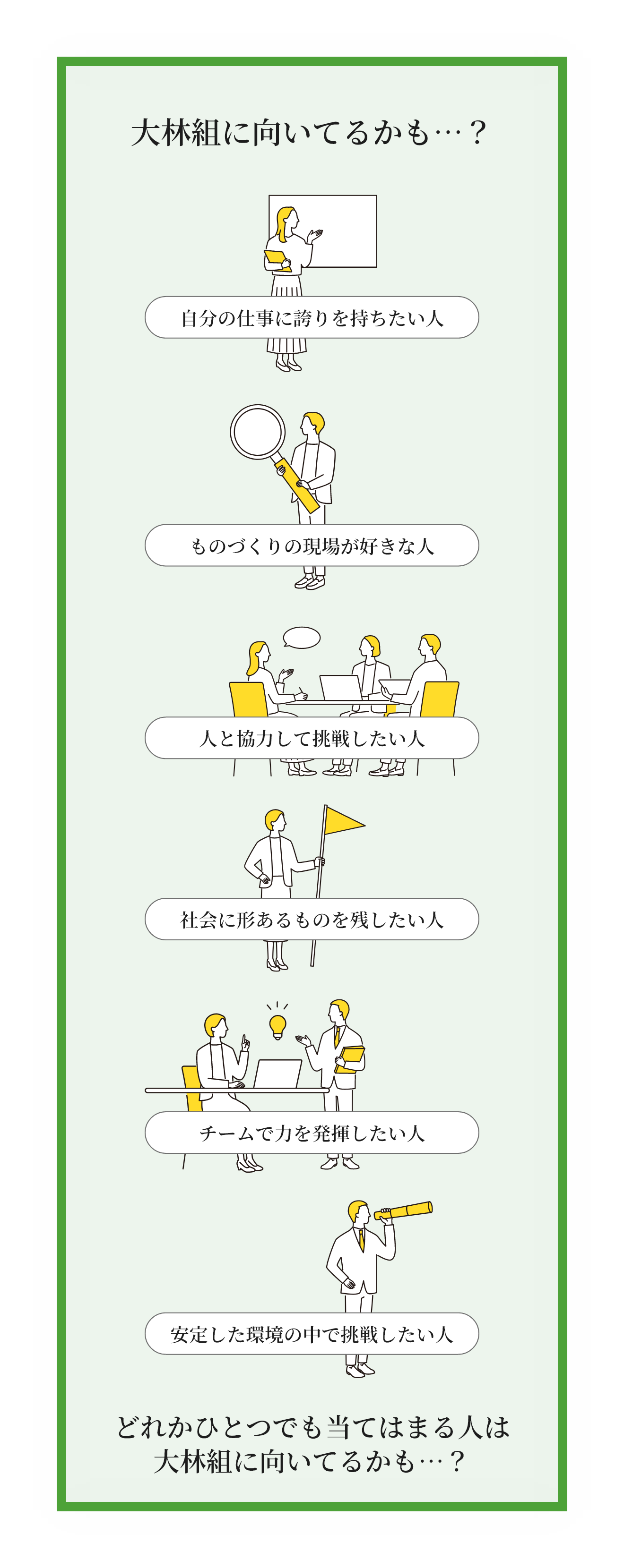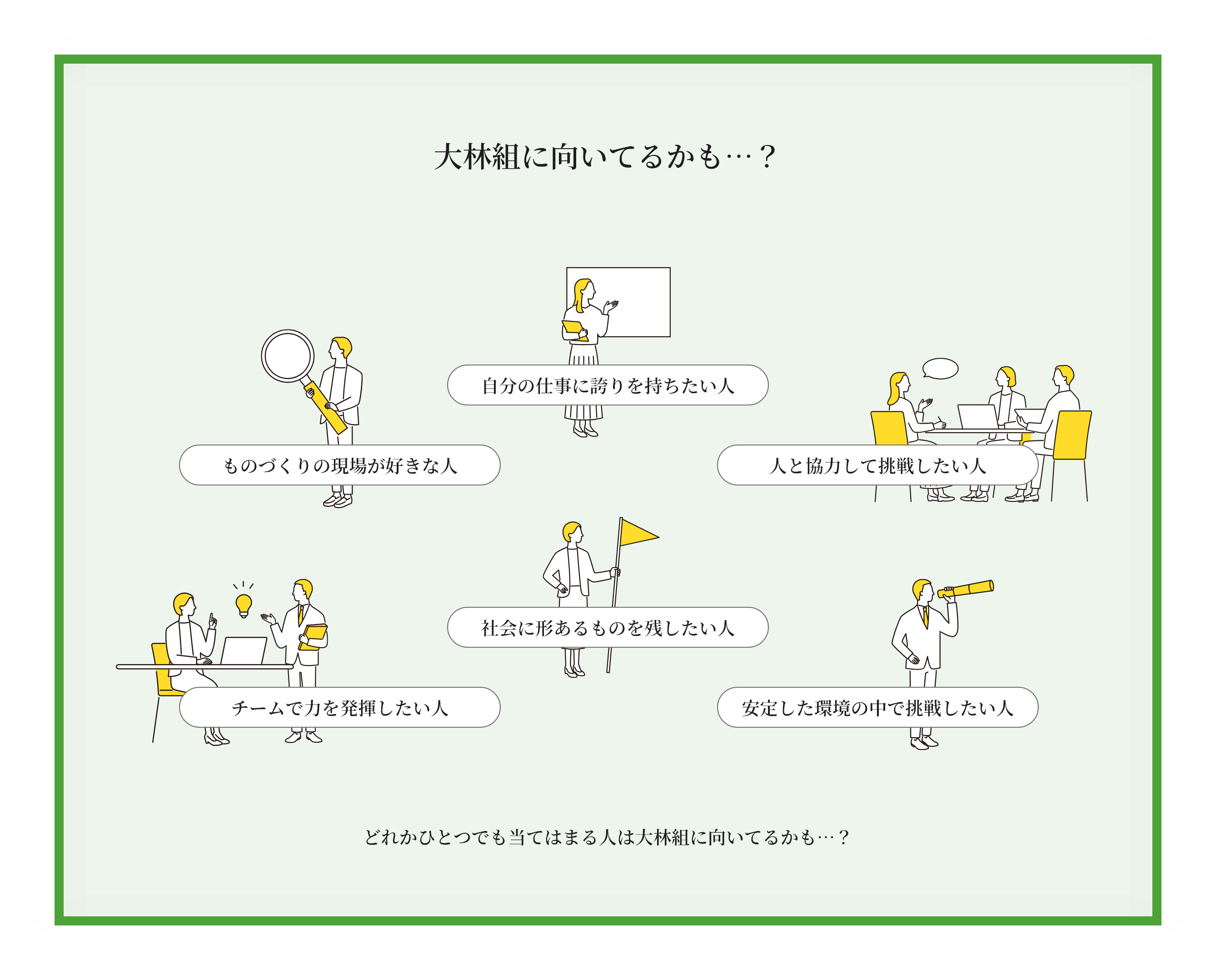 イベントやインターンシップへの参加は、選考の必須条件ではありません。どんな形でも大林組に関心を持ってくださる全ての方に、平等にチャンスがあります。