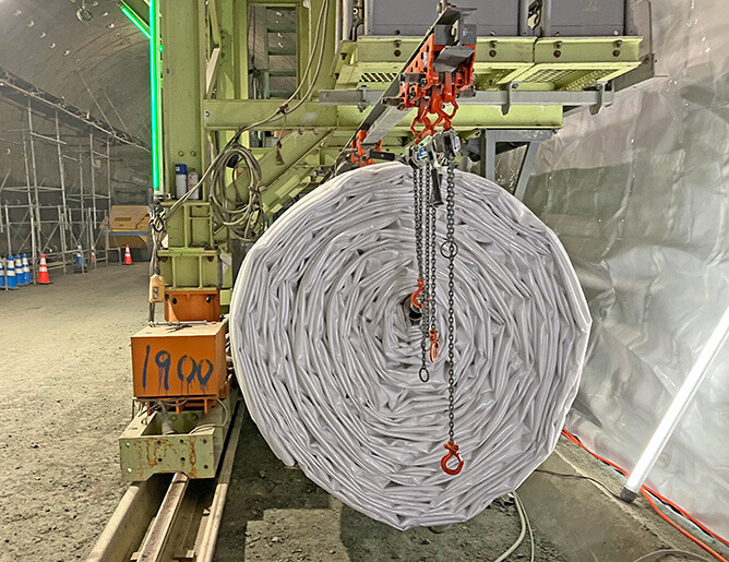 山岳トンネル工事では、完成後の周辺地下水の円滑な排水、覆工面への漏水防止、覆工と地山の縁切り(アイソレーション効果(※1))によるひび割れ抑制などを目的として、覆工打設前の吹付けコンクリート面に防水シートを張り付けます。