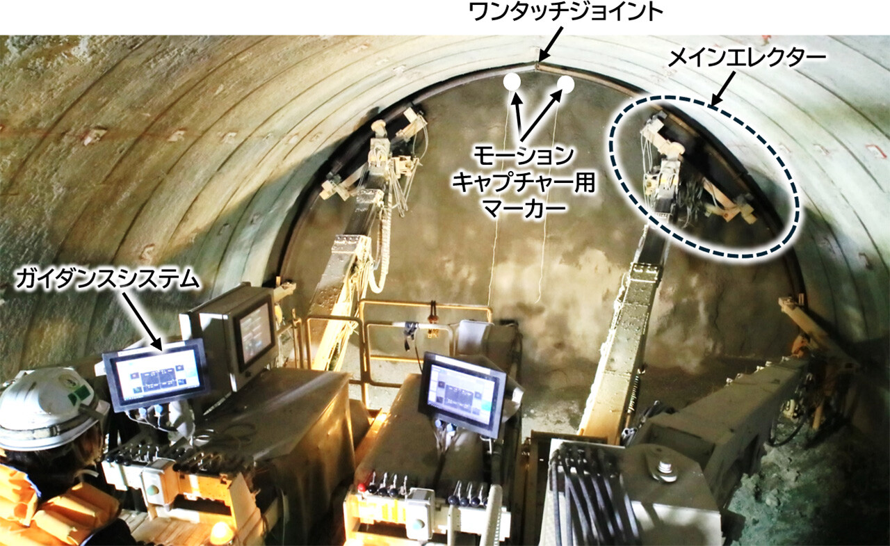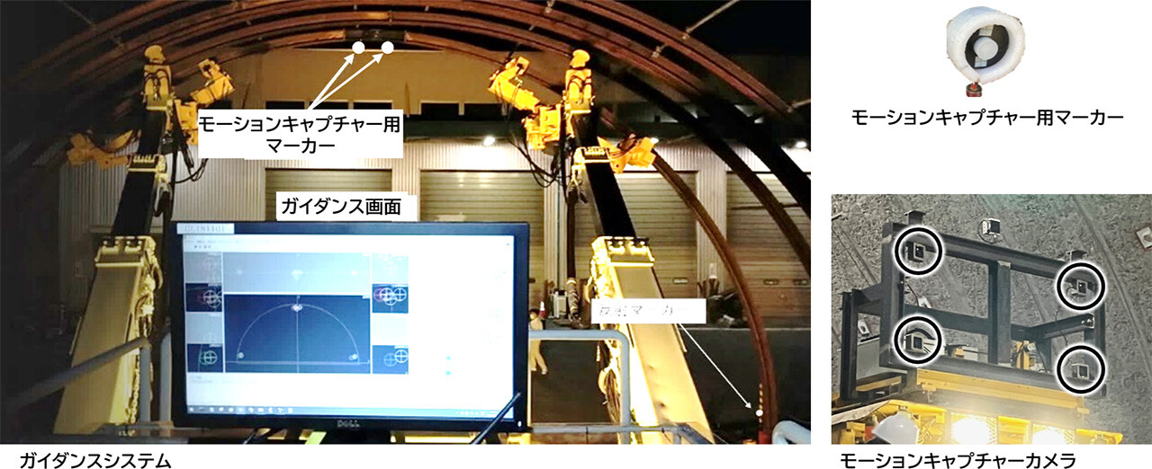 - 支保工に取り付けたマーカー(位置を識別するための目印)を、4台の専用カメラでリアルタイムに追跡するモーションキャプチャ技術(※1)をガイダンスシステム(※2)に採用し、エレクター(※3)を高精度に誘導