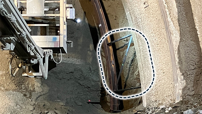 - 支保工建て込みの作業員が切羽直下に立ち入ることなく建て込み作業が可能です。危険エリアでの作業を完全に排除することで、安全性を飛躍的に向上させます。支保工に金網を事前に取り付けておくことで、切羽での金網取り付け作業も不要となり、さらなる安全性向上につながります。