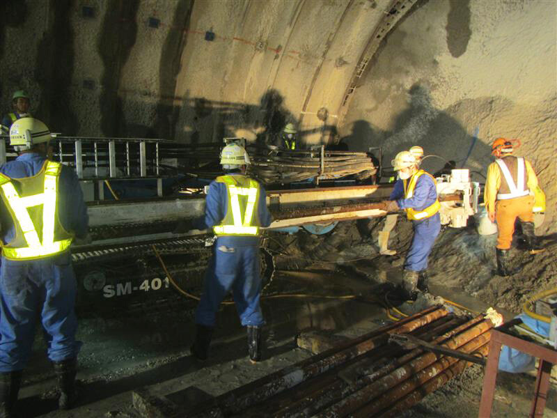 水圧ハンマーナビを含む切羽前方探査技術は、一般的にロッド(長い棒状の掘削用工具)1本の削孔ごとに、次のロッドを2人以上でセットし、オペレーターとの合図により継ぎ手(接合部)の接続と削孔を繰り返して行います。