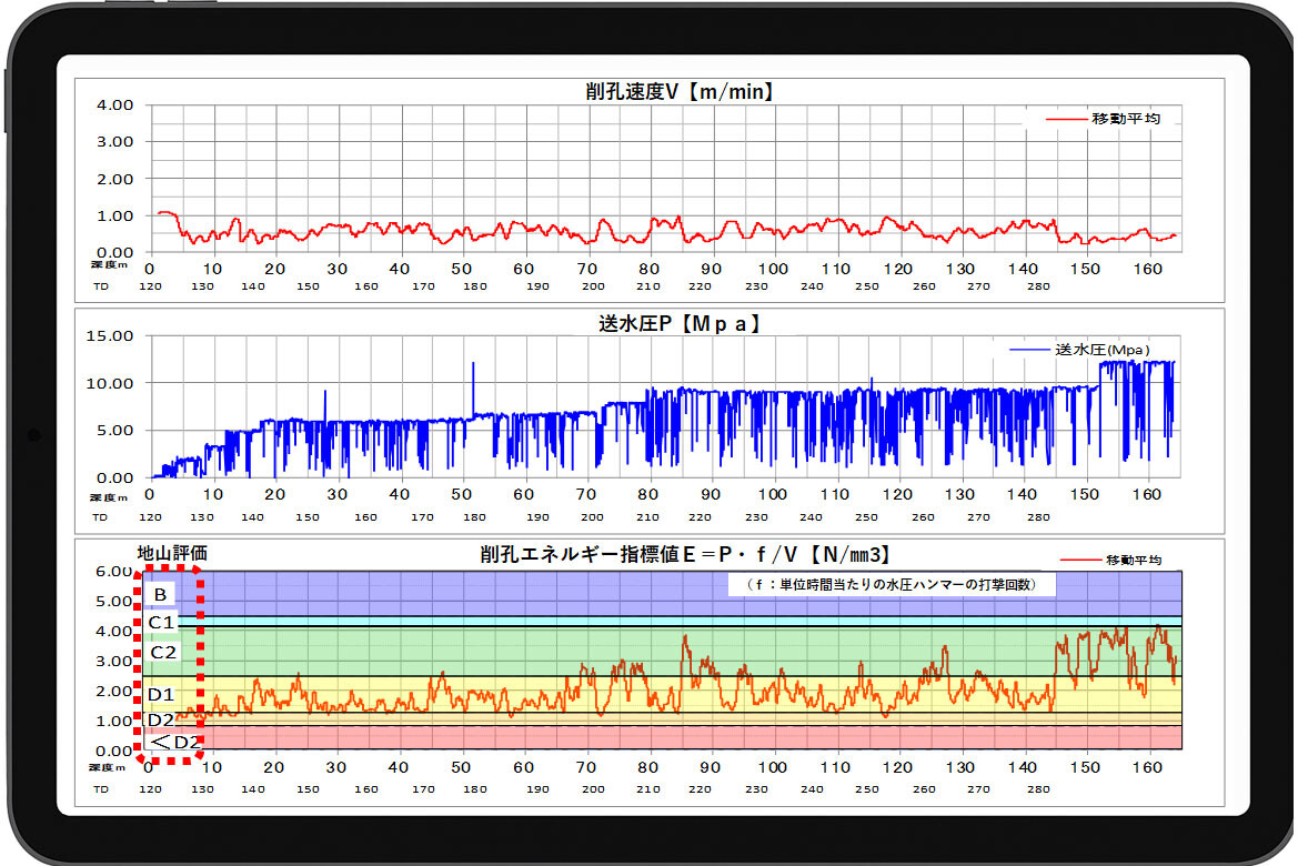 - 削孔時に、削孔深度や削孔速度、送水圧、フィード圧、地山等級などがリアルタイムで確認できるため、自動削孔においても、不良地山が判断できます。