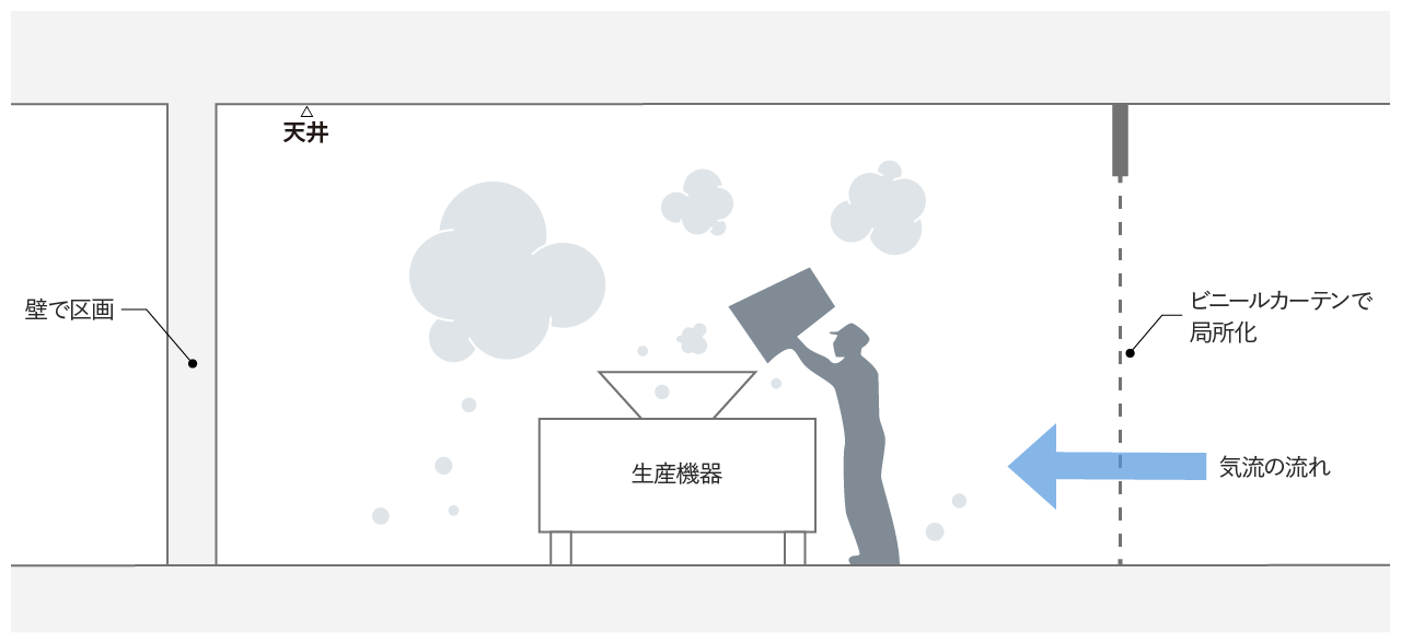 粉体原料を拡散させない対策として、粉体取扱いエリアを平面的に区画し、気流が粉体取扱いエリア外からエリア内に流れるような空調を計画します。