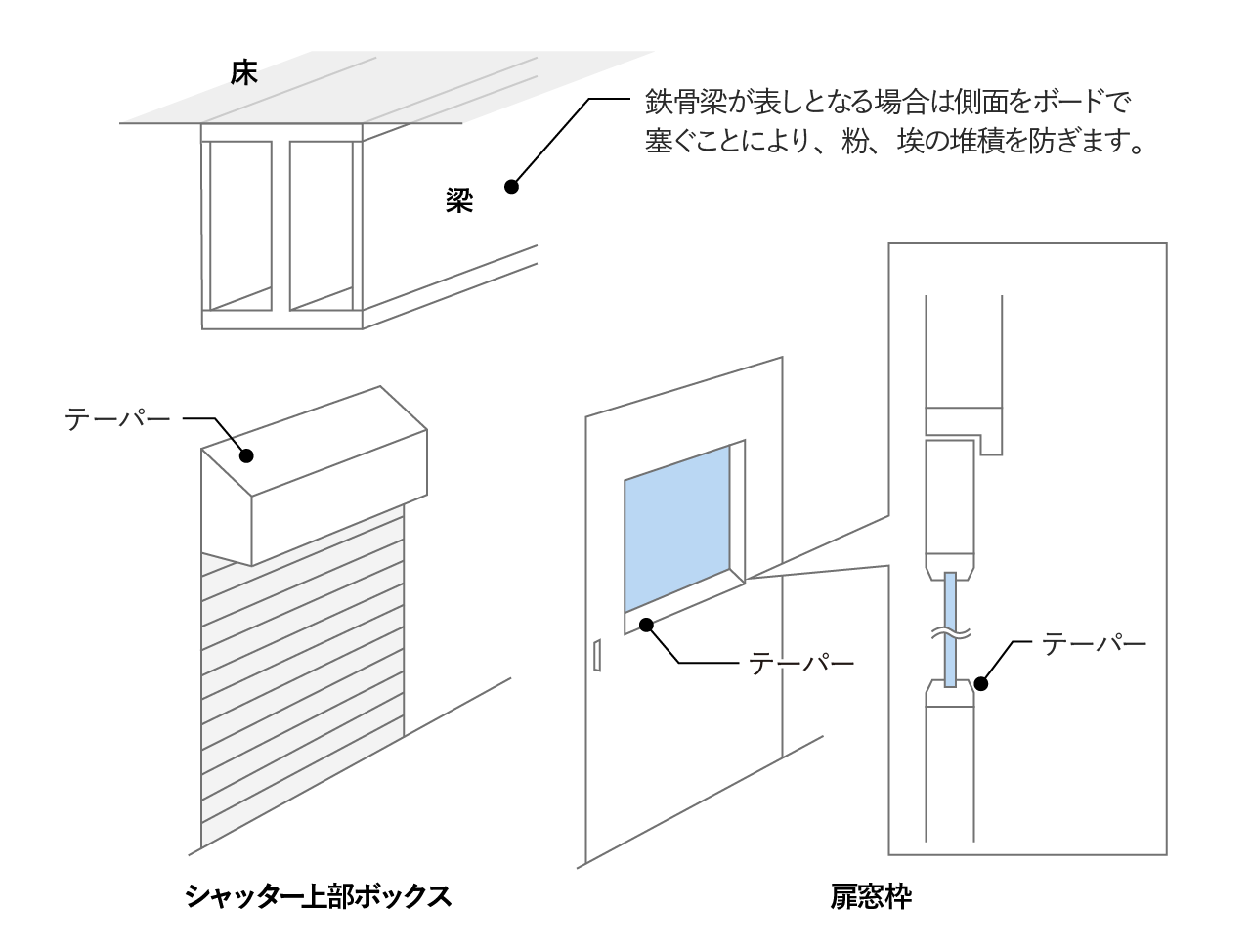 粉体の堆積を抑える方法として、梁形や建具などの水平部分を少なくする納まりを採用します。