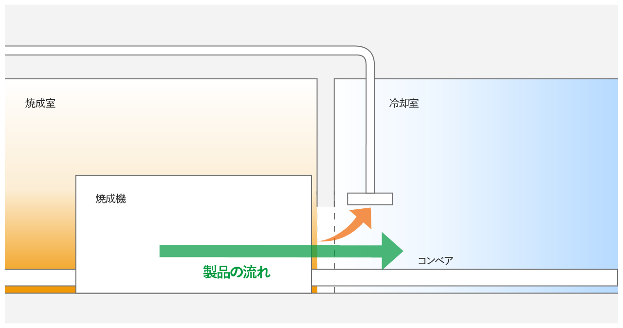 焼成機など熱を発する大型設備はできるだけ空間が狭くなるように区画します。焼成室の開口部周りでは気流をコントロールし、熱が他の部屋に拡散しないように計画します。