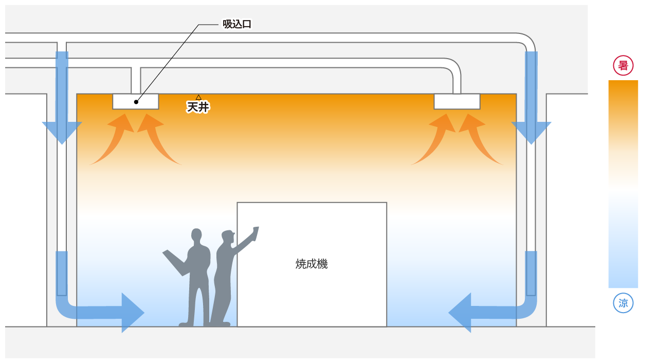 単体の焼成機や原料溶解機など発熱する生産設備が大部屋に同居する場合は、置換空調やスポット空調により作業環境を改善するよう計画します。
