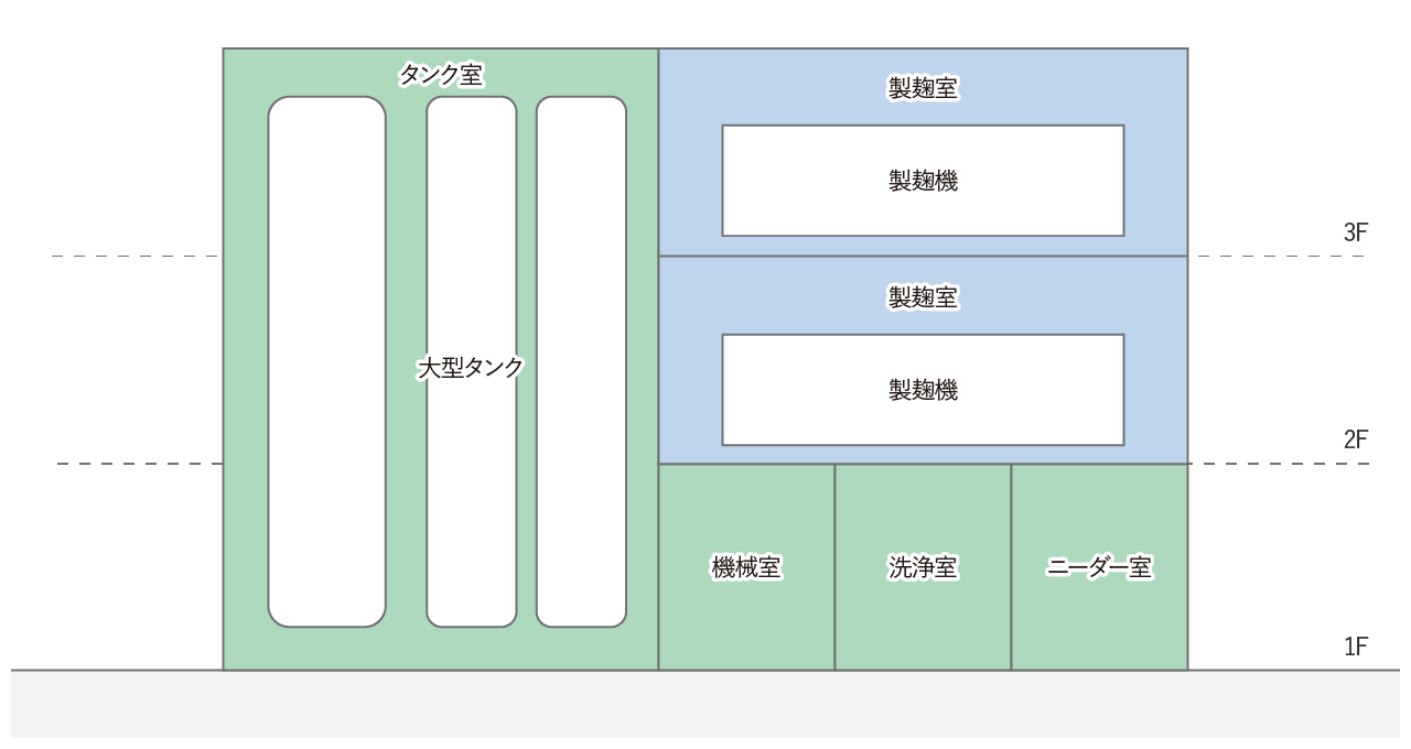 タンク室と製麹室の立体的な配置(味噌製造施設の例)