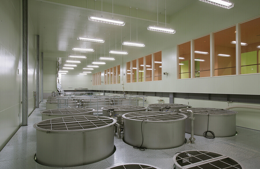 生産設備の計画においては、お客様へのヒアリングや既存施設の調査などを通して生産に関わる条件を整理し、お客様のニーズを的確に把握します。生産ラインを理解し、生産量に沿って各工程での処理量を算定した上で、各工程の生産機器や保管設備の比較・検討・選定を行います。微生物を利用するため、温湿度管理に配慮した設計をします。包装後の製品をパレタイズし、自動倉庫への搬入の自動化も検討可能です。生産設備の施工においては、工事監理と施工監理を適切に行い、品質の高い生産ラインを完成させます。