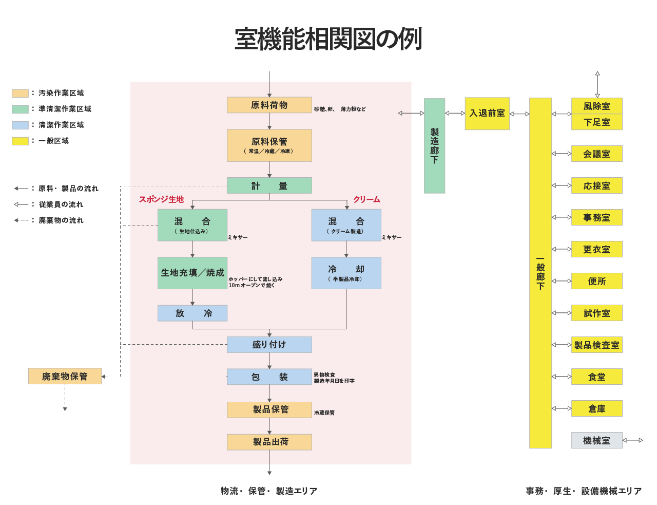 - 効率的な建築計画を検討するため、各工程室間の人と物の流れを室機能相関図にて整理します。