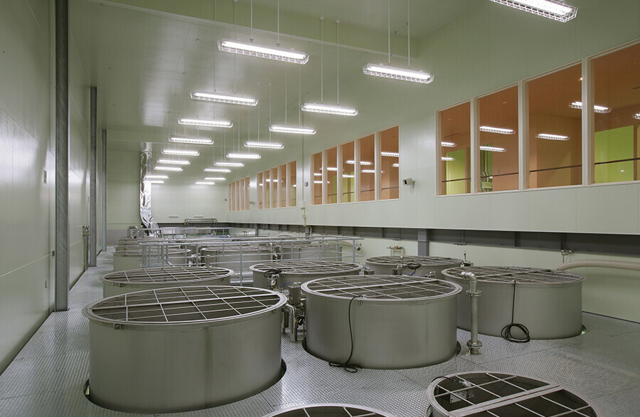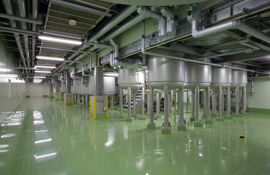 事業計画に基づく生産量設定から生産設備のレイアウト、建屋計画、概算見積についてお客様とフィージビリティスタディを重ね、機能性が高い工場を最適コストで完成させました。近代的な製造ライン(タンク仕込み)と、昔ながらの手作りライン(甕(かめ)仕込み)を、生産設備すべて一括で計画し、施工しています。
