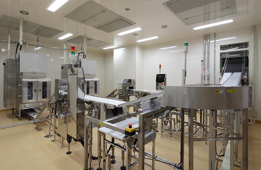 原料貯蔵、供給装置、充填(てん)包装設備、ピロー搬送設備、自動倉庫設備の計画と施工により、機能的な工場を完成させました。 クリーンルームの品質を確保するため、クリーンプロトコルによる工事を計画、実施しています。 お客様工事の生産設備を含めた総合調整業務も行いました。
