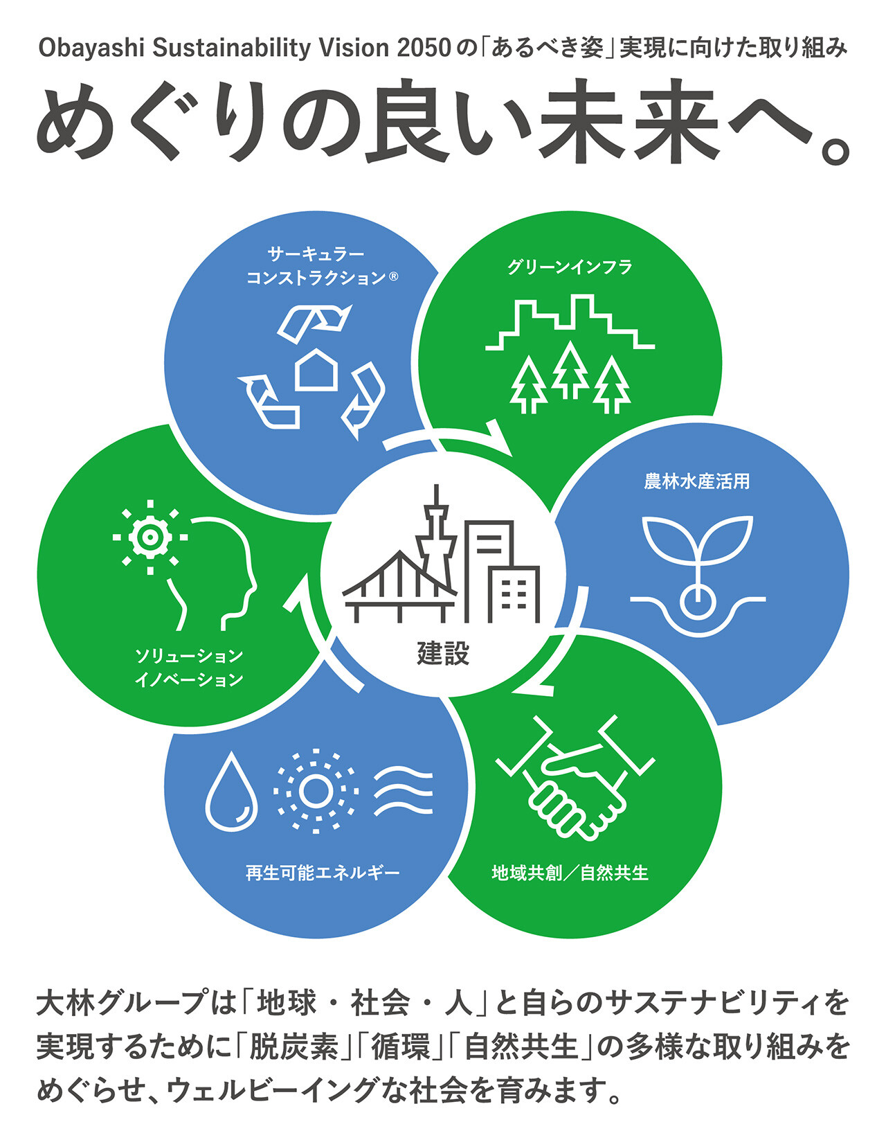 大林グループは、「地球に優しい」良き企業市民として、環境問題に対する自主的な取り組みと、その継続的改善を経営の重要課題の一つとして位置づけ、すべての事業活動を通じて「Obayashi Sustainability Vision 2050」に掲げる「地球・社会・人のサステナビリティの実現」に向けて貢献します。